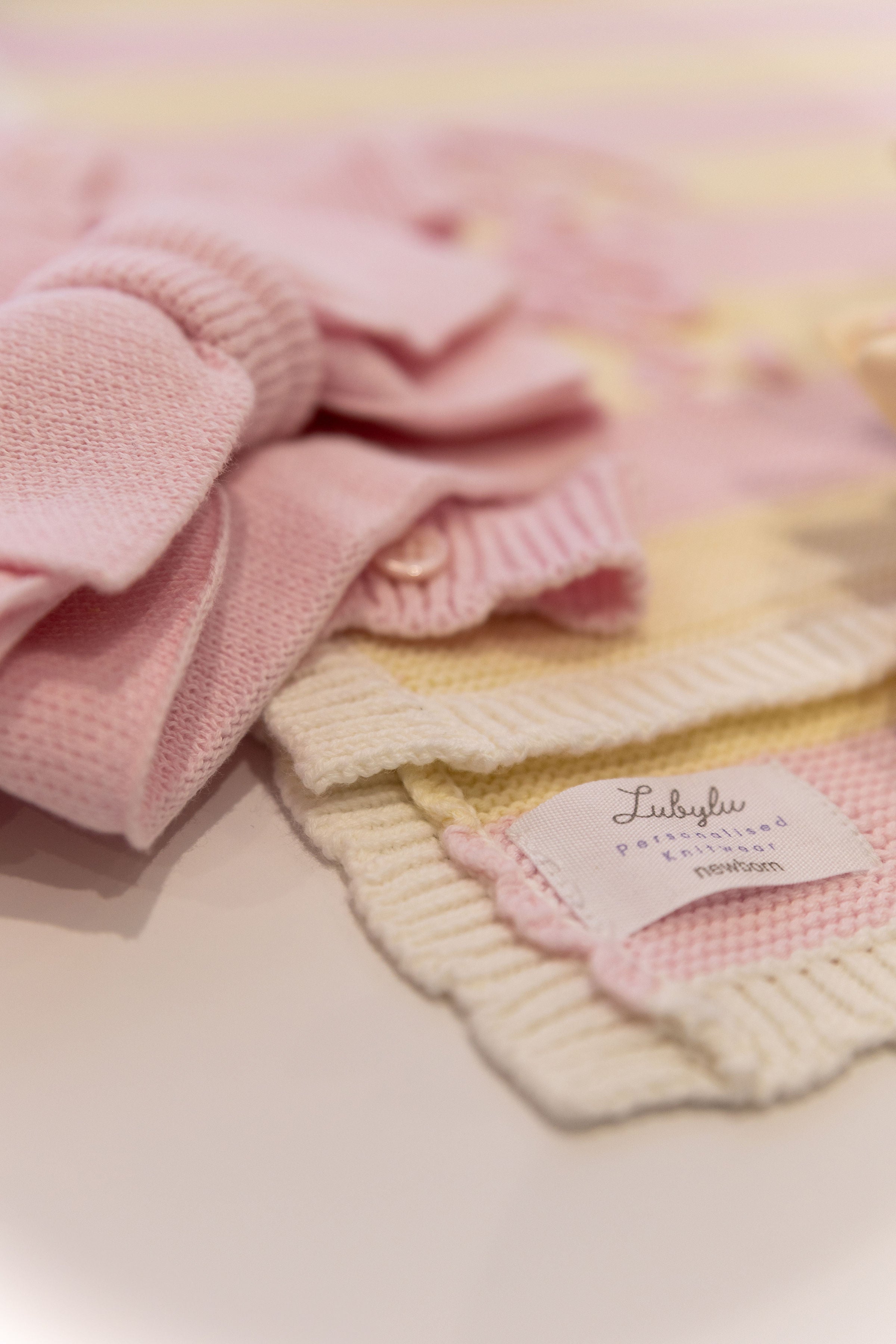 Inspired by the soft hues of childhood treats, this collection brings together knitted rompers, cardigans, bows, and blankets in gentle pinks and yellows. Available individually or as a coordinated bundle, each piece can be personalised for a thoughtful, playful finish.